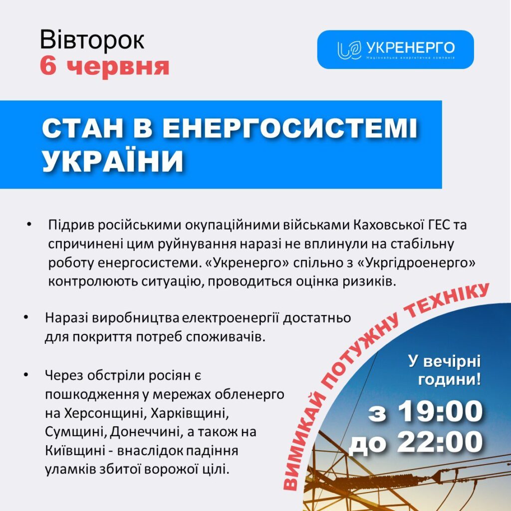 “Укренерго” в подальшому повідомлятиме про вплив наслідків катастрофи на стан енергосистеми. Будь ласка, користуйтеся лише офіційними джерелами інформації.