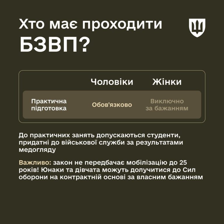 У вересні 2025 року в Україні розпочинається обов’язкова базова загальновійськова підготовка (БЗВП) для студентів закладів вищої освіти. Це нововведення є частиною комплексної реформи системи військової підготовки громадян та реалізується відповідно до змін до Закону України «Про військовий обов’язок і військову службу», підписаних Президентом України Володимиром Зеленським 15 січня 2025 року.