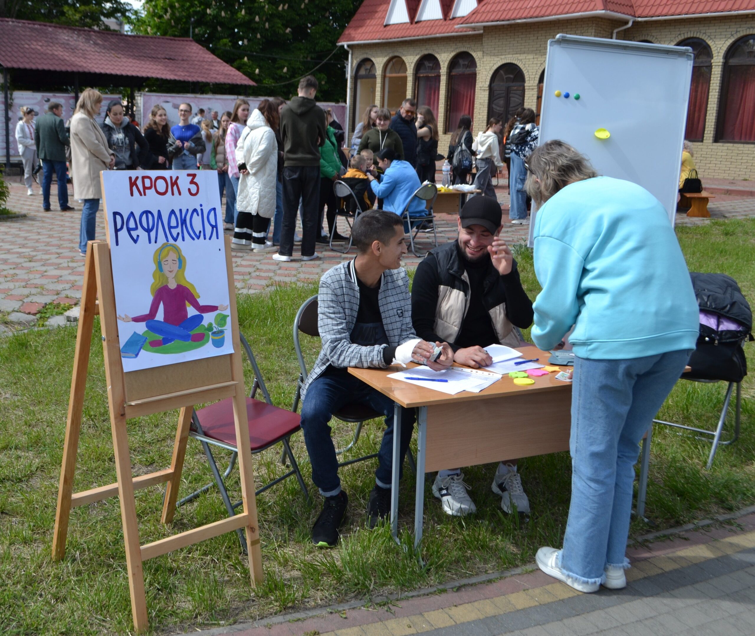 Третім кроком «Рефлексія» опікуваласяпрактична психологиня, психотерапевтка, координаторка «Кімнати терапії іграшкою» Ольга Чайківська. Тут люди, які пройшли два попередні кроки, мали змогу поділитися віднайденими власними сенсами, порозмірковувати про них та ухвалити рішення, які з надбаних усвідомлень забрати із собою у майбутнє. На кожному кроці фахівчині з ментального здоров’я допомагали людям знайти підтримку та опору, усвідомити та визнати самоцінність, знайомили громадськість з інструментами турботи про себе та плекання стійкості. Дбати про свій внутрішній стан — це не слабкість, а необхідність, пояснювали психологині.