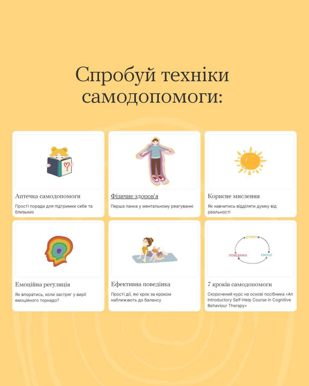 Розділ «Самодопомога» постійно поповнюється ефективними інструментами для підтримки ментального здоров’я.