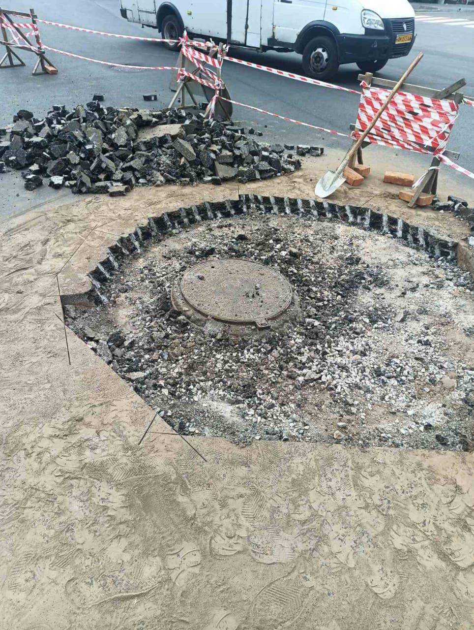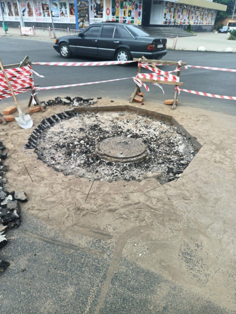 На ділянці вул. Шевченка, що межує з вул. Європейською, через прихований раніше під землею дефект – пошкоджену плиту перекриття на водогінному колодязі – проходять ремонті роботи. Проблему виявили під час укладання третього шару асфальту, що проходило, згідно визначеного плану робіт.