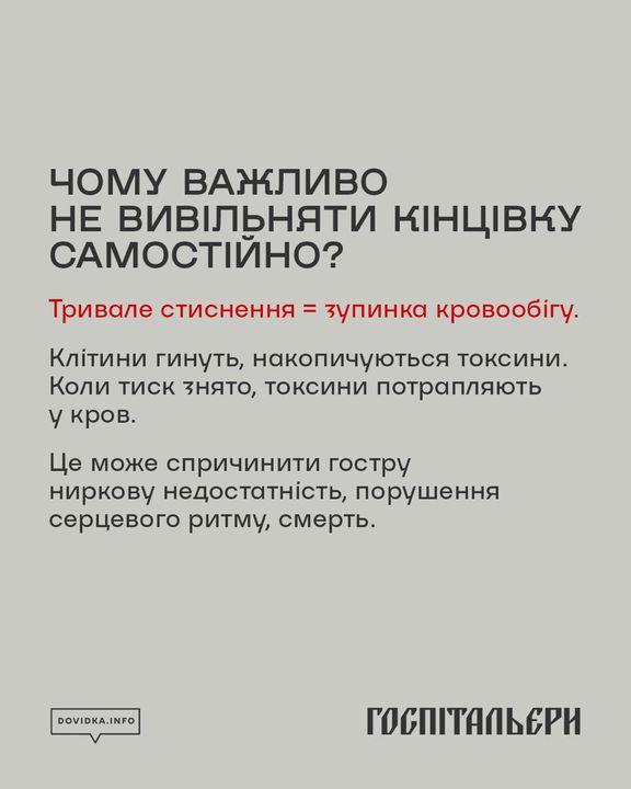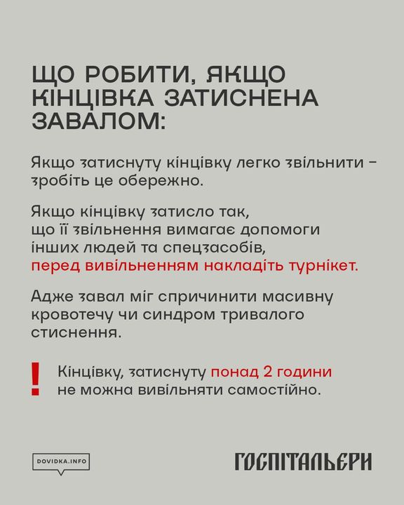 Буває, що під завалами людину затискає уламками конструкцій. Якщо кінцівку можна легко вивільнити — робіть це дуже обережно. Однак якщо кінцівку затиснуло серйозно, і для звільнення потрібна допомога інших людей чи спецзасобів, категорично не можна робити це самостійно без попереднього накладання турнікета. Адже ви можете пошкодити великі судини, що призведе до масивної кровотечі.