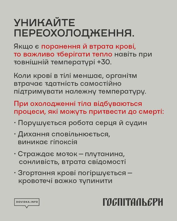 Навіть при плюсовій температурі ризик переохолодження залишається високим, особливо якщо людина має поранення або втратила багато крові. Організм втрачає здатність самостійно підтримувати температуру, що може призвести до тяжких наслідків: порушення роботи серця, гіпоксії, порушень свідомості та зупинки згортання крові.