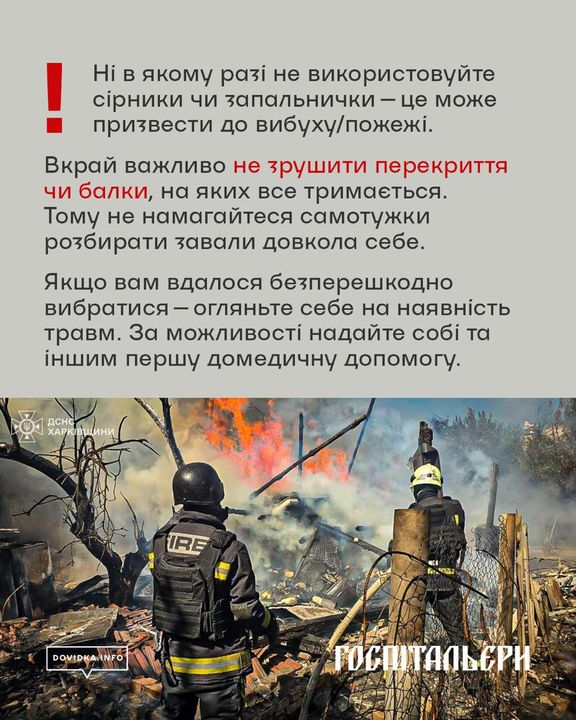 У жодному разі не використовуйте сірники чи запальнички, адже це може призвести до вибуху або пожежі через можливі витоки газу. Уникайте будь-яких спроб самостійно розбирати уламки — це може спричинити обвал всієї конструкції.