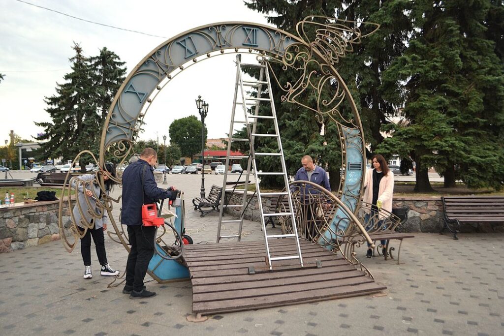 Роботу почали з того, що очистили елементи Арки від нальоту і залишків старої фарби. Далі в хід пішли фарбопульт та пензлі. На меті мали привести до належного вигляду всю конструкцію – від містка-основи і до самої верхівки.